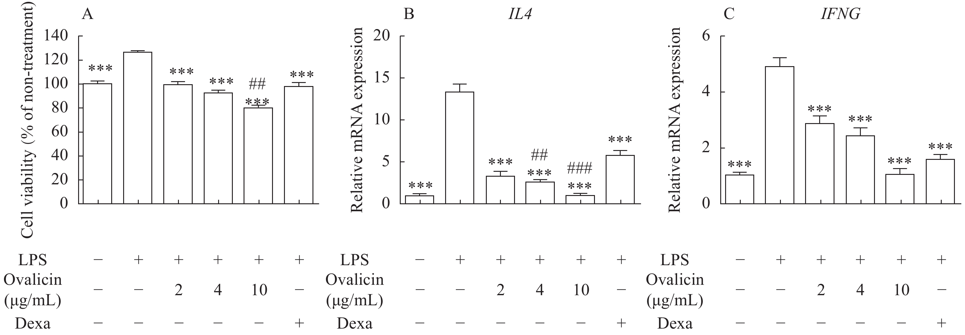 Atopic dermatitis (AD) is a common skin disorder difficult to be treated with medication. This study investigated the potential of ovalicin extracted from Cordyceps militaris for the treatment of AD using in vitro and in vivo models. We found that, in canine macrophage cell line DH82, lipopolysaccharide (LPS) upregulated the expression of genes associated with inflammation and pruritic responses through activating calcium and interleukin-31 (IL-31) signaling, and the upregulation could be suppressed by ovalicin, with an effect significantly stronger than dexamethasone. Ovalicin also reduced the expression of IL-31 downstream genes, including JAK2 (Janus kinase 2), TRPV1 (transient receptor potential vanilloid receptor-1), and HRH2 (histamine receptor H2). Ovalicin significantly alleviated the allergic symptoms in the AD mouse model. Histologically, the number of macrophages and mast cells infiltrated in the dermis was significantly reduced by ovalicin treatment. In the skin tissue of AD mice, reduction of IL-31 receptor was observed in the ovalicin treated group compared to the group without ovalicin treatment. To our knowledge, this is the first study to elucidate the anti-atopic mechanism of ovalicin, which could be an alternative to steroidal drugs commonly used for AD treatment.