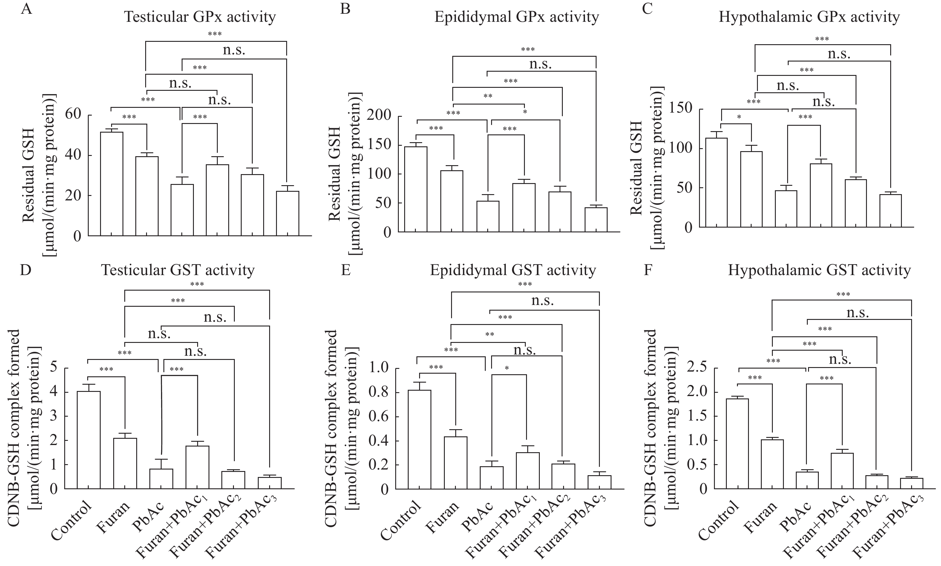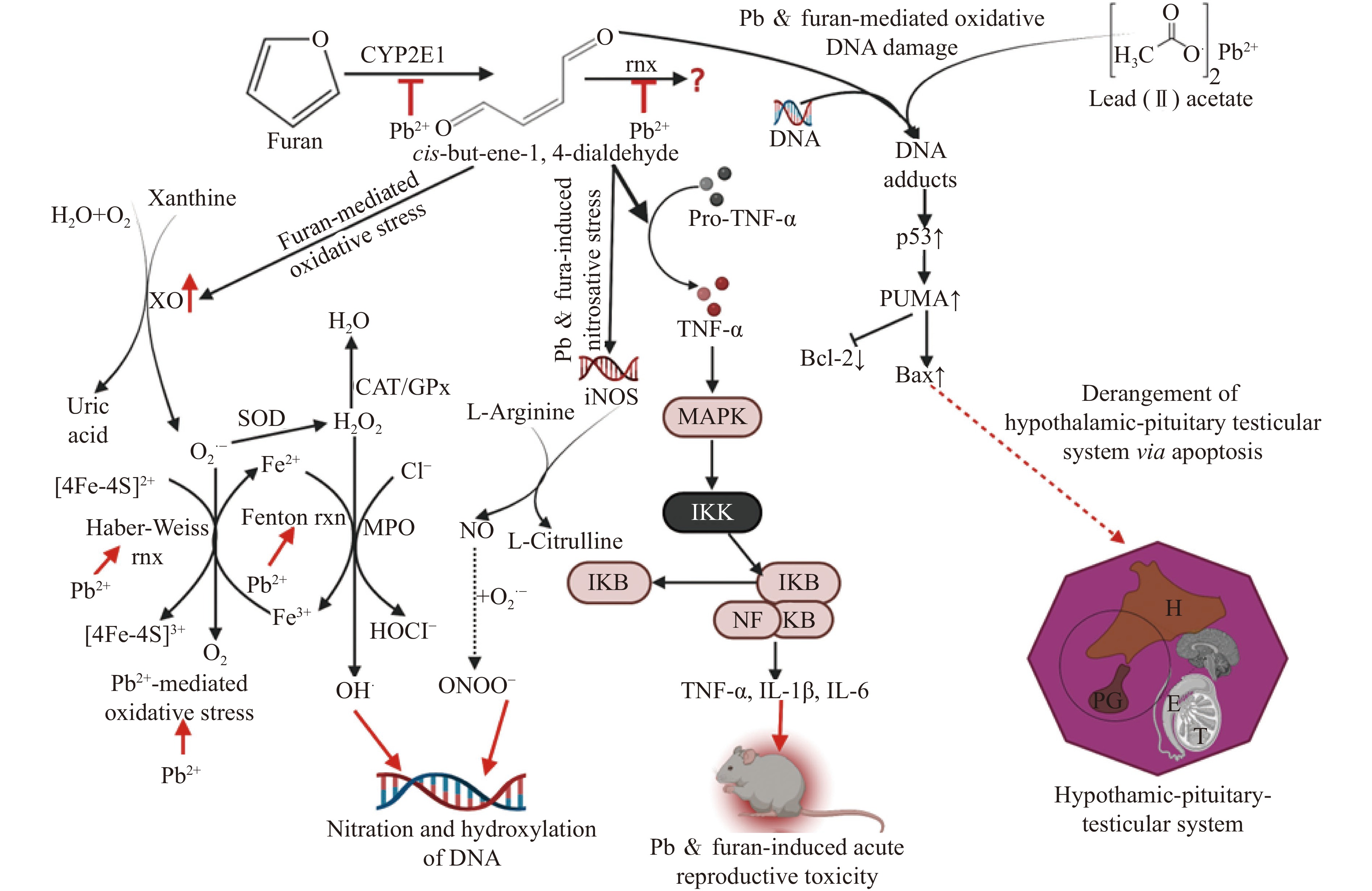 • Lead (Pb) and furan are toxic agents, and persistent exposure may impair human and animal reproductive function. We therefore explored the effects of Pb and furan on male rat hypothalamic-pituitary-gonadal reproductive status, oxidative stress, inflammation, and genomic integrity. We found that co-exposure to Pb and furan reduced the activities of testicular function enzymes, endogenous antioxidant levels, total sulfhydryl group, and glutathione. Sperm abnormality, biomarkers of oxidative stress, inflammation, and p53 expression were increased in a dose-dependent manner by treatment with furan and Pb. Typical rat gonad histoarchitecture features were also damaged. Conclusively, co-exposure to Pb and furan induced male reproductive function derangement by decreasing the antioxidant defences in rats, increasing abnormalities in spermatozoa morphology, and reducing reproductive hormone in circulation. These pathophysiological alterations, if persistent, might provide a permissive environment for potentiating reproductive dysfunction and infertility.