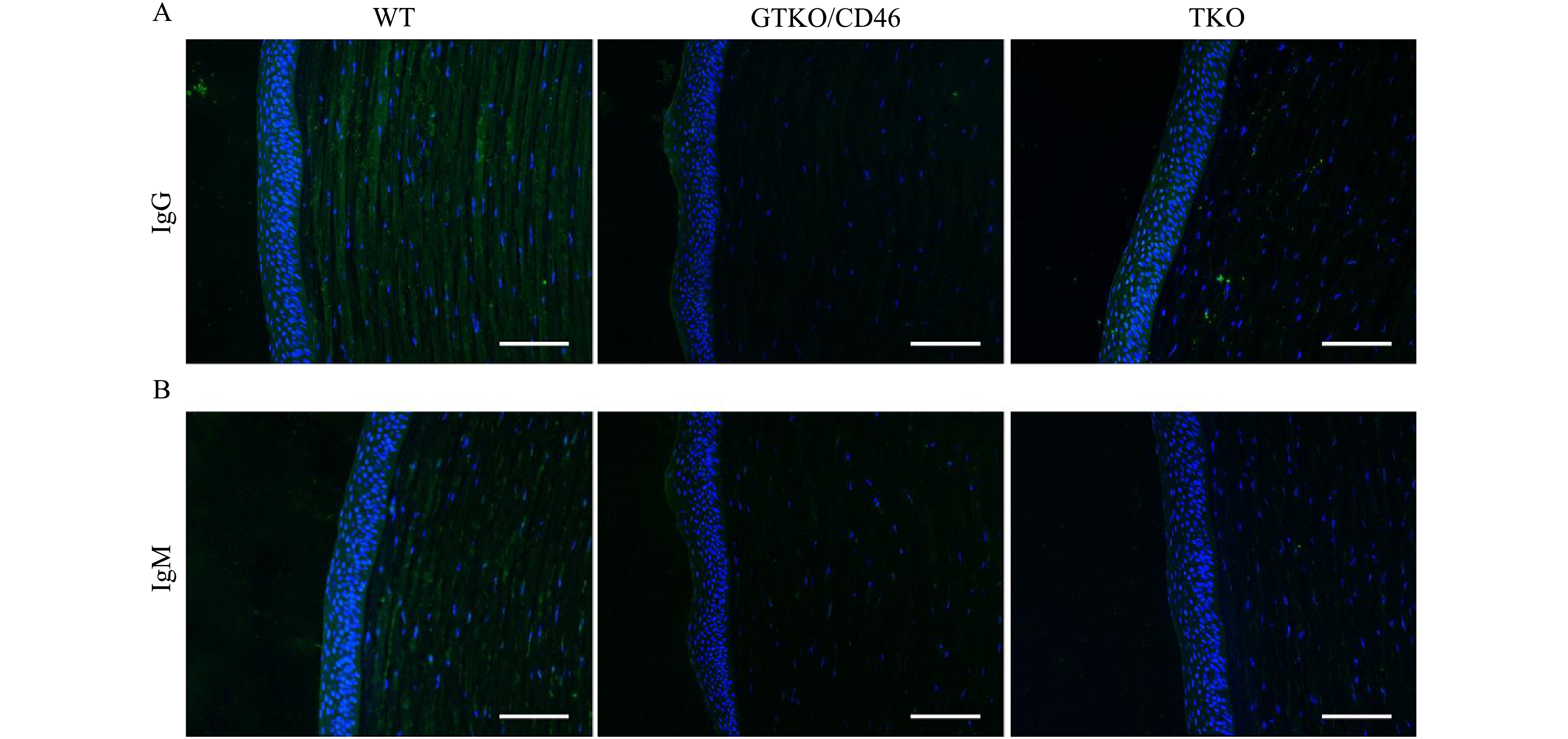 Clinical xenotransplantations have been hampered by human preformed antibody-mediated damage of the xenografts. To overcome biological incompatibility between pigs and humans, one strategy is to remove the major antigens Gal, Neu5Gc, and Sd(a) present on pig cells and tissues. Triple gene (GGTA1, CMAH, and β4GalNT2) knockout (TKO) pigs were produced in our laboratory by CRISPR-Cas9 targeting. To investigate the antigenicity reduction in the TKO pigs, the expression levels of these three xenoantigens in the cornea, heart, liver, spleen, lung, kidney, and pancreas tissues were examined. The level of human IgG/IgM binding to those tissues was also investigated, with wildtype pig tissues as control. The results showed that αGal, Neu5Gc, and Sd(a) were markedly positive in all the examined tissues in wildtype pigs but barely detected in TKO pigs. Compared to wildtype pigs, the liver, spleen, and pancreas of TKO pigs showed comparable levels of human IgG and IgM binding, whereas corneas, heart, lung, and kidney of TKO pigs exhibited significantly reduced human IgG and IgM binding. These results indicate that the antigenicity of TKO pig is significantly reduced and the remaining xenoantigens on porcine tissues can be eliminated via a gene targeting approach.