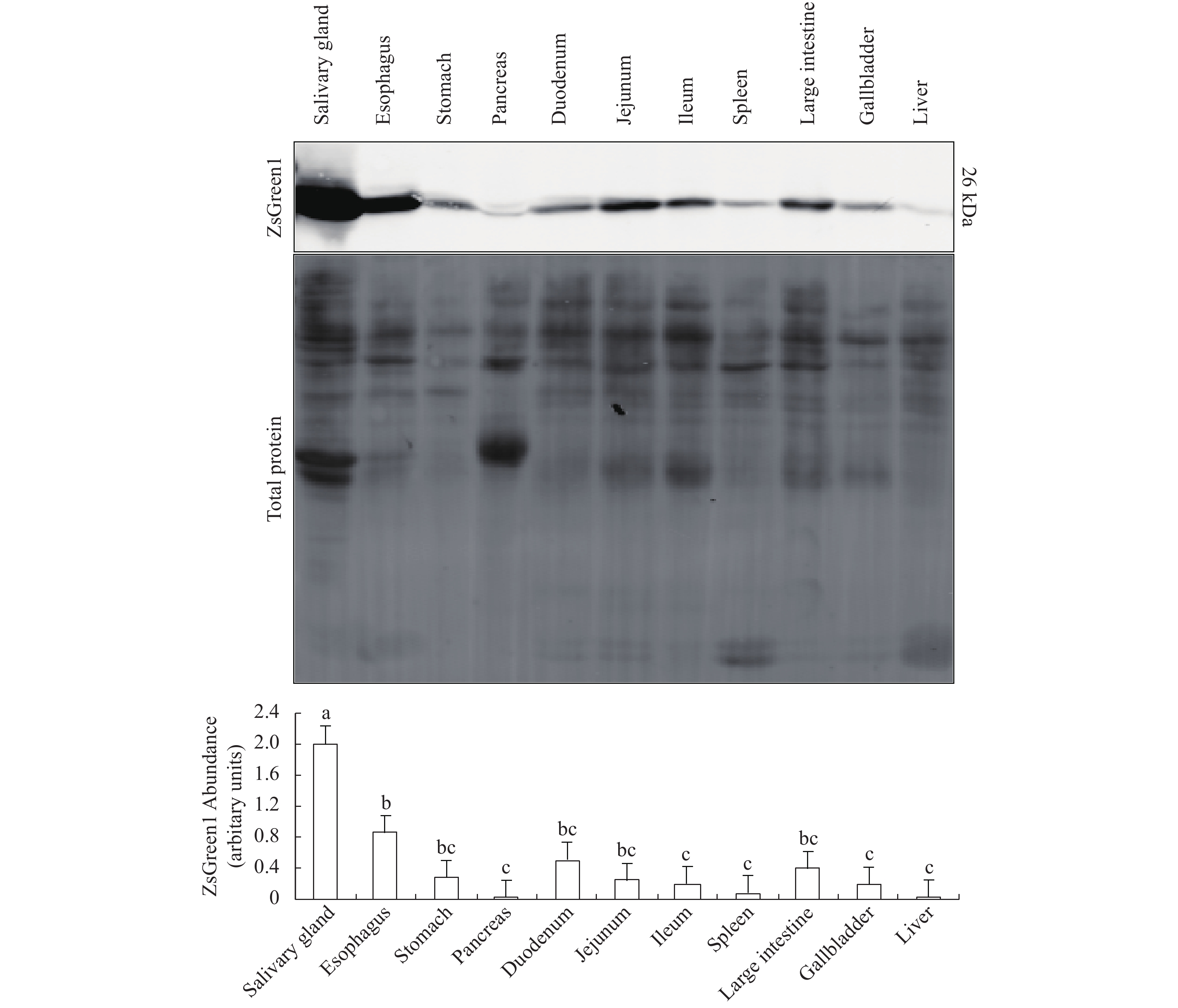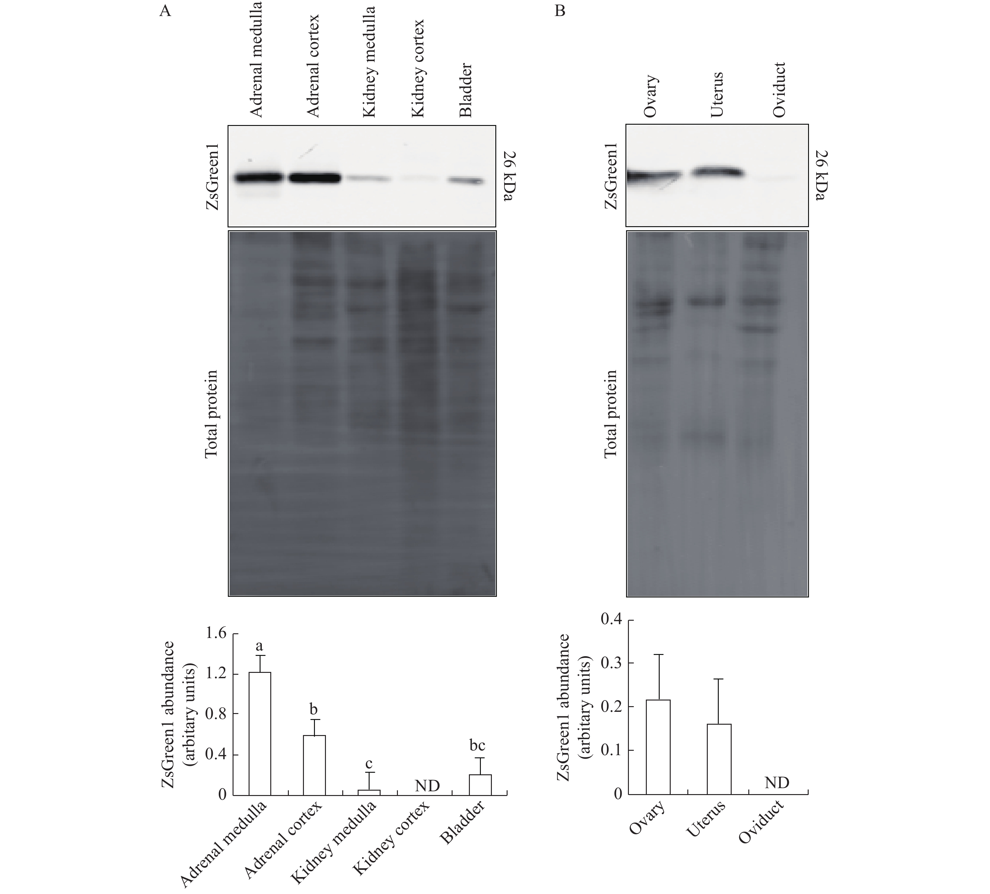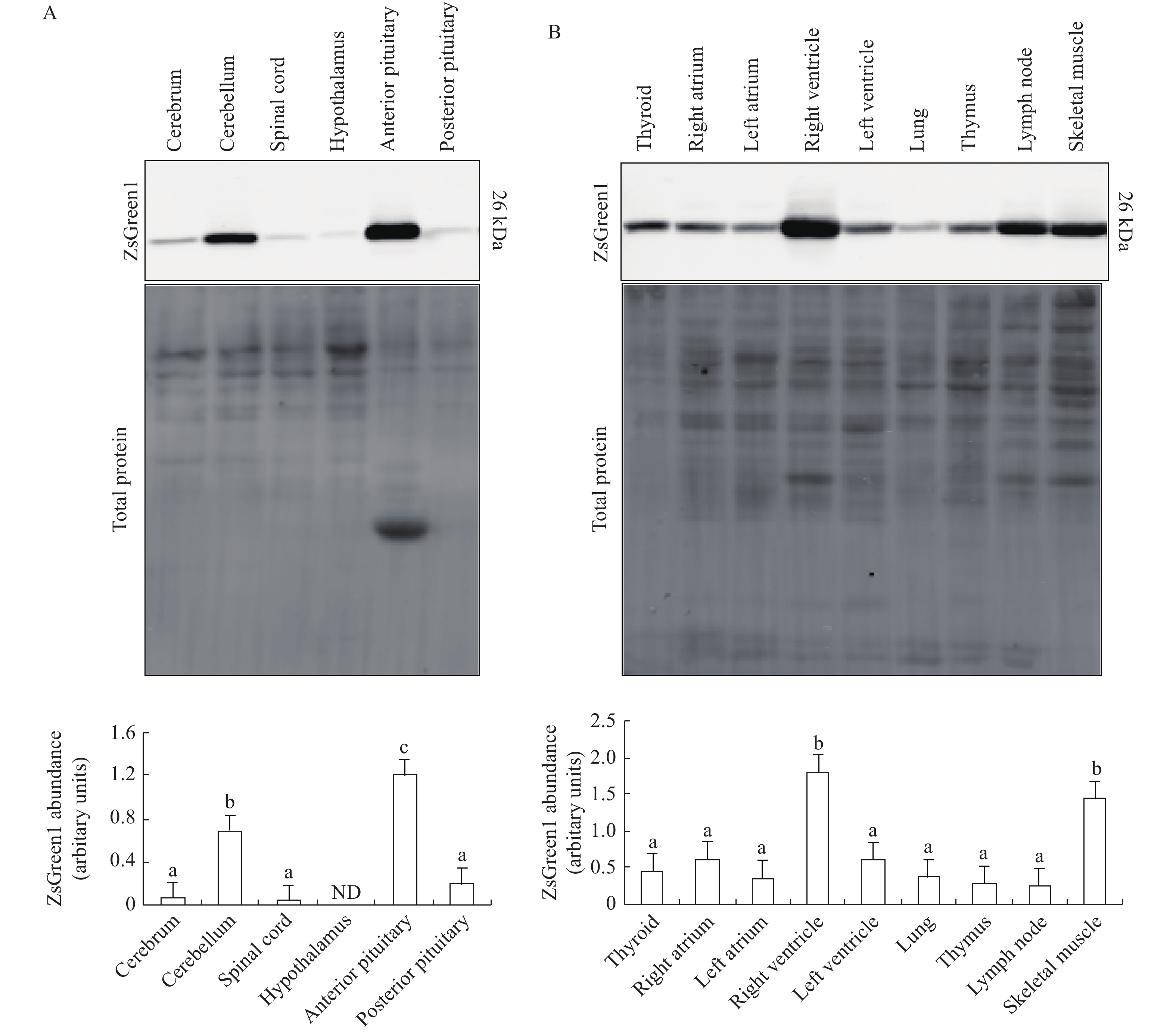 Since genetic engineering of pigs can benefit both biomedicine and agriculture, selecting a suitable gene promoter is critically important. The cytomegalovirus (CMV) promoter, which can robustly drive ubiquitous transgene expression, is commonly used at present, yet recent reports suggest tissue-specific activity in the pig. The objective of this study was to quantify ZsGreen1 protein (in lieu of CMV promoter activity) in tissues from pigs harboring a CMV-ZsGreen1 transgene with a single integration site. Tissue samples (n=35) were collected from neonatal hemizygous (n=3) and homozygous (n=3) piglets and ZsGreen1 abundance was determined via immunoblotting. ZsGreen1 was detected in all tissues, except hypothalamus, kidney cortex and oviduct. The expression patterns of homozygous and hemizygous piglets were similar (P>0.05). However, quantification revealed that ZsGreen1 protein levels were tissue-specific. Within neural/endocrine tissues, ZsGreen1 abundance was highest in the anterior pituitary gland, intermediate in the cerebellum and lowest in the cerebrum, spinal cord and posterior pituitary (P<0.05). In the digestive system, ZsGreen1 was more abundant in the salivary gland than esophagus, stomach, pancreas, duodenum, jejunum, ileum, spleen, colon, gallbladder and liver (P<0.05). Interestingly, ZsGreen1 amounts also differed within an organ (i.e., the right ventricle had 3-fold higher levels than the other heart chambers; P<0.05). These results provide useful information for the use of the CMV promoter to drive transgene expression in the pig. Moreover, this swine model represents a novel resource of ZsGreen1-labeled organs and a valuable tool to advance genome editing research.